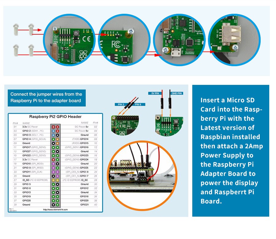 صفحه نمایش 7 اینچی با صفحه نمایش لمسی برای Raspberry Pi به کاربران امکان می دهد تمام پروژه های یکپارچه مانند تبلت ها، سیستم های سرگرمی و پروژه های جاسازی شده را ایجاد کند. نمایشگر 800 × 480 از طریق یک برد آداپتور متصل می شود که تبدیل انرژی و سیگنال را کنترل می کند. دو اتصال به Pi مورد نیاز است؛ قدرت از پورت GPIO Pi و یک کابل روبان که به پورت DSI موجود در Raspberry Pi متصل است. درایورهای لمسی با پشتیبانی از لمس 10 انگشت و یک صفحه کلید روی صفحه به یک آخرین سیستم عامل Raspbian برای قابلیت کامل بدون یک صفحه کلید یا ماوس فیزیکی.